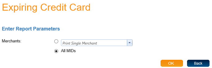 When you select "Expiring Credit Cards" you will come to a screen where you can enter report parameters. The Expiring Credit Cards report only has one parameter, "Merchants". You can either search by single merchant or "All MIDs".