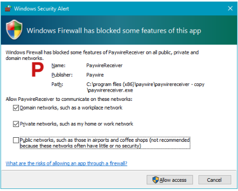 5. If the Windows Security Alert appears, check the options for Paywire Receiver to use internet connection depending on your network setting, then click on “Allow access”.