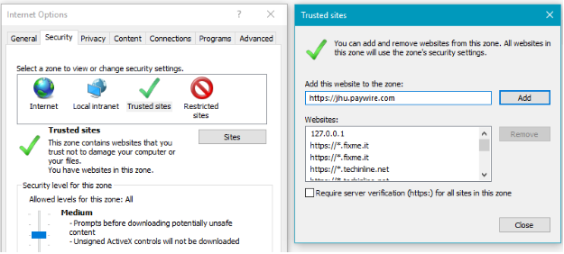 Add https://jhu.paywire.com to trusted sites if it is not already added.