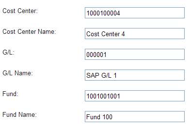 The SAP requirements depend on the type merchant. For type B merchants the SAP data is fixed. The data can either be fixed to one set or no data required. Therefore, type B merchants will have just one field each for Cost Center, G/L, Fund Number, and their names. When a transaction is processed, there will be no options to select Cost Center, G/L, or Fund because they have already been fixed on the Merchant Information page.