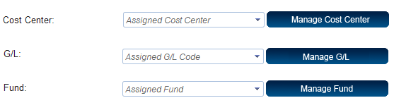 For type A merchants the data is not fixed and there can be one or many sets assigned to a merchant. Therefore, if a type A merchant is selected then you will be able to assign one or more Cost Centers, G/L Codes, and Fund Numbers by clicking the manage button next to each section. The drop down menu for each field will show what has already been assigned.
