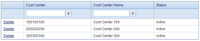 The Cost Centers can be accessed from the Merchant Information Page. Click on Manage Cost Center to go to the Cost Center Management for the respective merchant. The Cost Centers for the merchant will be listed. You can search through the Cost Centers using the filters above each column. To delete a Cost Center click Delete in the row of the Cost Center you want deleted.