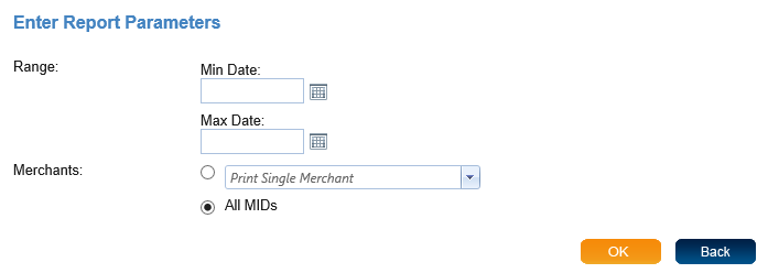 When you select Recurring Payment Account Information you will come to a screen where you can enter report parameters. The first parameter is a date range. Type in a "Min Date" and a "Max Date" or click the calendar icon next to the fields to pick a date from the calendar. If the date range is left blank, all dates will be included. Next you can search by Merchants. You can either search by single merchant or All MIDs.