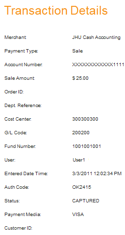 After you have searched for transactions and have a list, you can select each individual transaction. Clicking Select next to a particular transaction will show the transaction details. Once you have reviewed the transaction details click Back to perform a new search.
